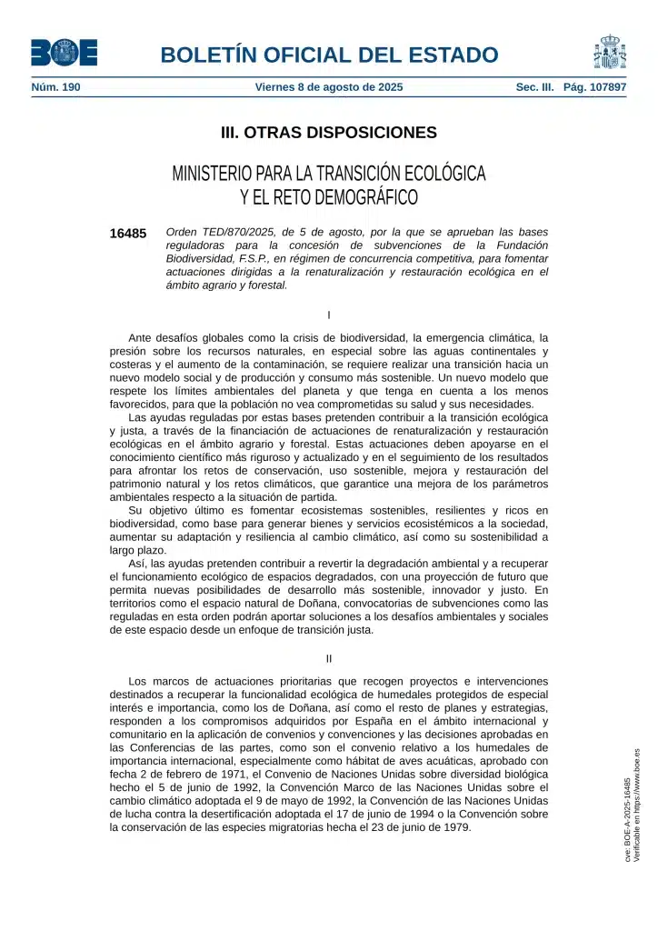 Se comunica publicación en BOE de hoy de Orden TED/870/2025, de 5 de agosto, por la que se aprueban las bases reguladoras para la concesión de subvenciones de la Fundación Biodiversidad, F.S.P., en régimen de concurrencia competitiva, para fomentar actuaciones dirigidas a la renaturalización y restauración ecológica en el ámbito agrario y forestal.