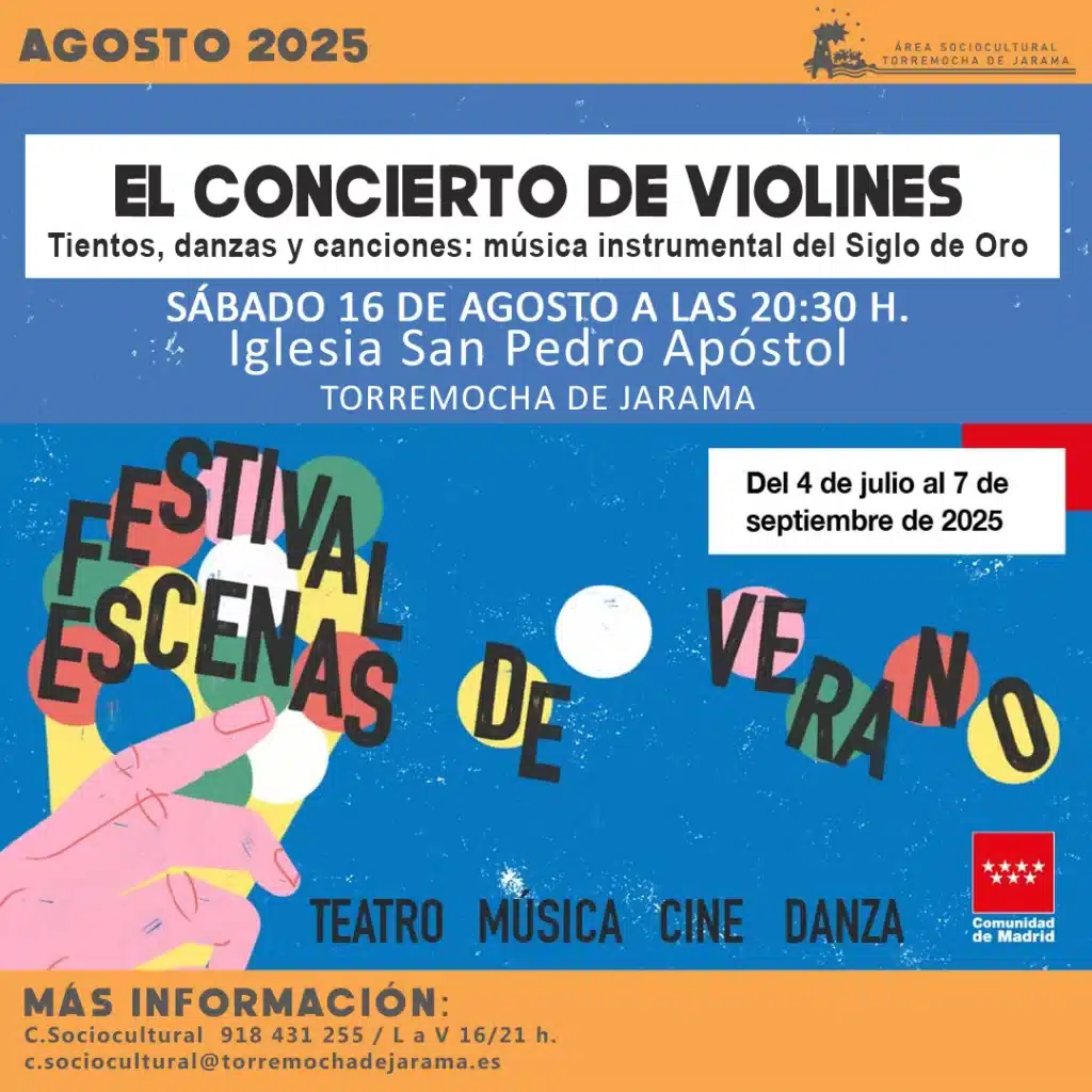 🎻✨ Concierto de Violines en Torremocha de Jarama🎶 Tientos, danzas y canciones: música instrumental del Siglo de Oro 📅 Sábado 16 de agosto🕣 20:30 h⛪ Iglesia San Pedro Apóstol – Torremocha de Jarama 🌟 Disfruta de una noche mágica dentro del Festival Escenas de Verano 🎭🎶🎬💃Un viaje musical que nos transportará siglos atrás con piezas
