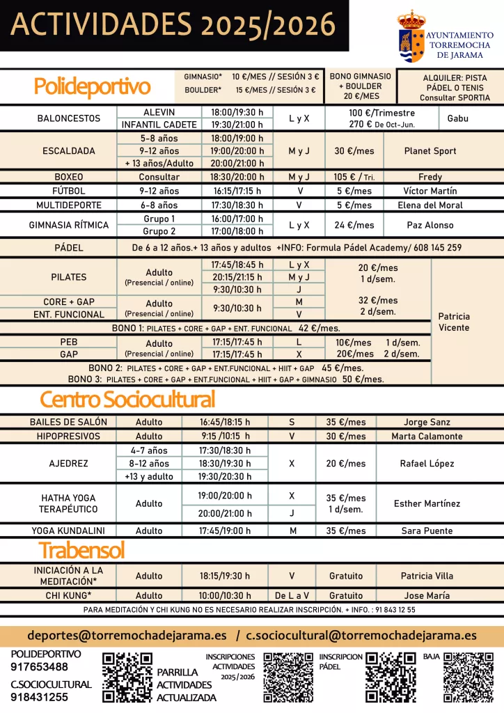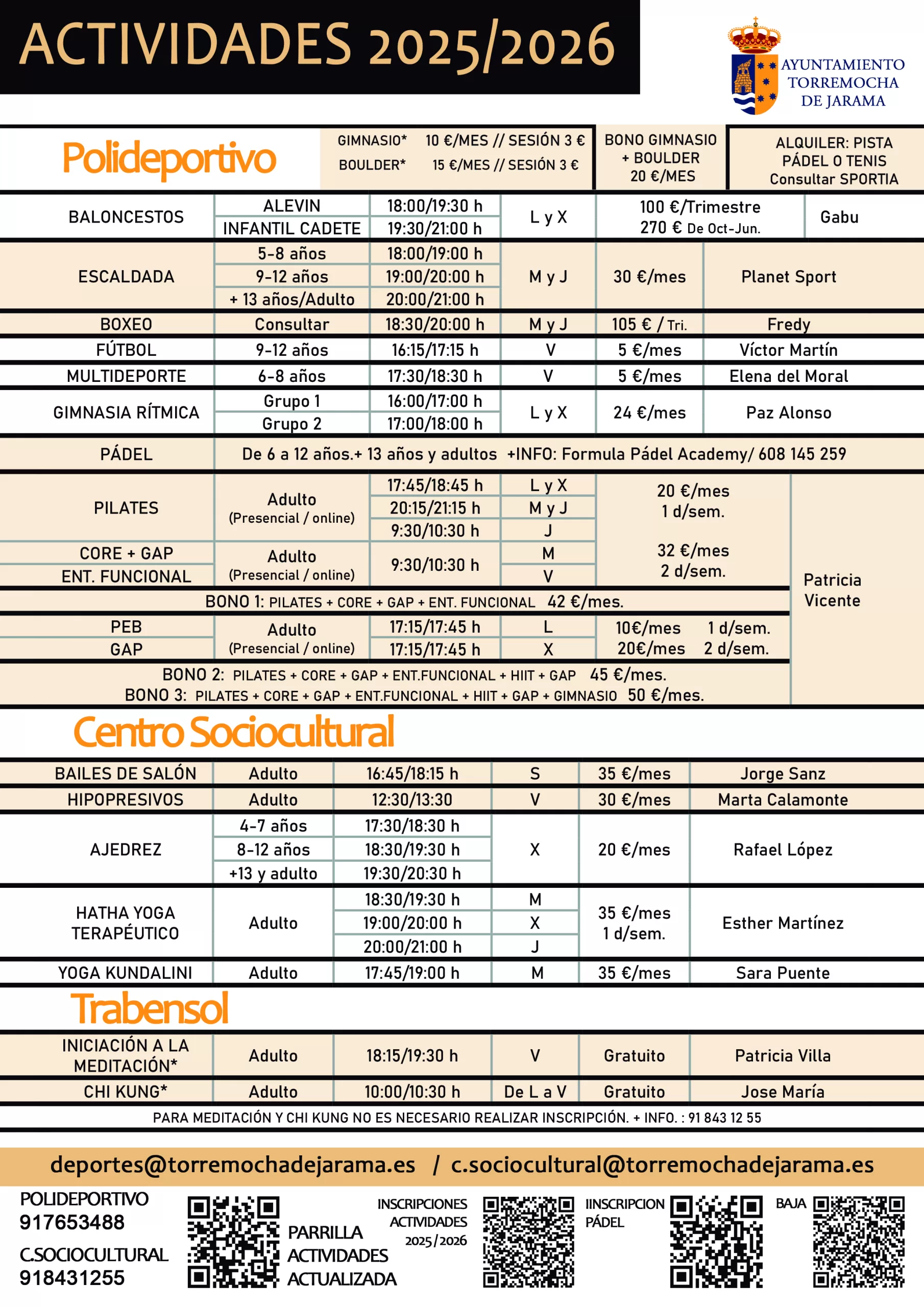 Cualquier duda contacta con nosotros a través del telf: 91 843 12 55 (De 16h a 21h) o a través del mail: c.sociocultural@torremochadejarama.es